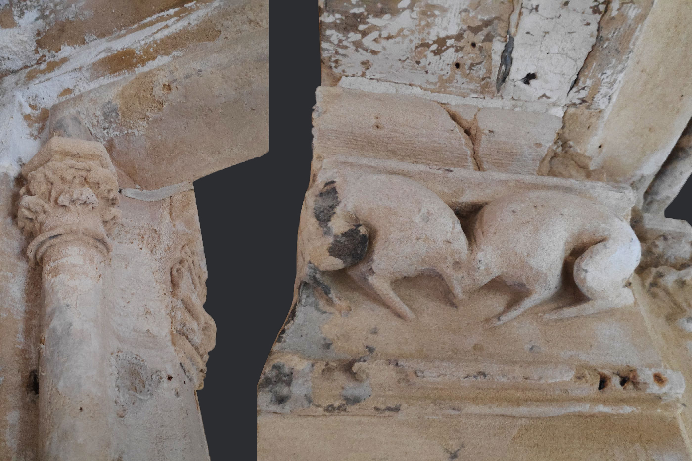 Sur les côtés de la porte, on peut distinguer des animaux affrontés, probablement un couple de lévriers et un gisant sculptés en bas-relief.